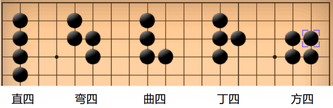 小 X 在解决了高大上的落子问题后, 开始着手训练 BetaGo 的深度学习 能力, 第一步要教 BetaGo识别各种各样的棋形,小 X 首先教 BetaGo 识别跟死活密切相关的棋型,在成功识别了一些简单的棋形后, BetaGo 在识别聚四棋形时遇到了困难,所谓聚四棋形就是连在一起的四颗棋子, 它们共有五种不同的形状, 五种棋形及其命名如下图所示: