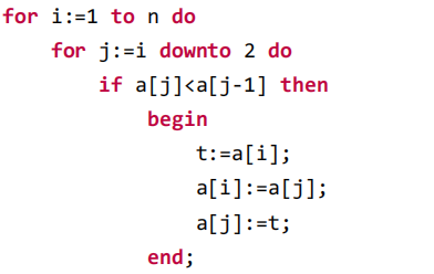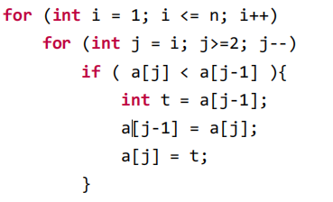 假设比较两个元素的时间为 O(1),则插入排序可以以 O(n2) 的时间复杂度完成长度为 n 的数组的排序。不妨假设这 n 个数字分别存储在 a1, a2, · · · , an 之中,则如下伪代码给出了插入排序算法的一种最简单的实现方式:
