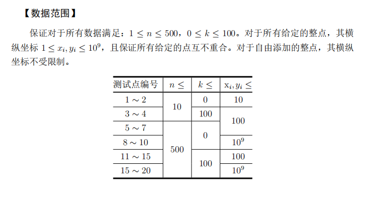 第一行两个正整数 n, k 分别表示给定的整点个数、可自由添加的整点个数。